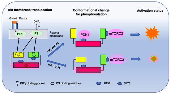 The translocation of cytosolic Akt to the plasma membrane is initiated by the interaction of the PH domain with membrane phosphatidylinositol 3,4,5-trisphosphate (PIP3), produced by phosphoinositide-3 (PI3) kinase upon growth factor receptor stimulation. Anionic PS, however, critically participates in the activation by securing the PIP3-triggered membrane translocation of Akt and facilitating its conformational changes for full activation. Through the interaction with positively charged residues of Akt at R15 and K20 in the PH domain outside the PIP3 binding pocket and at K419 and K420 in the regulatory domain [], PS facilitates the interdomain conformational changes of Akt to expose T308 and S473 for phosphorylation by upstream protein kinases PDK1 and mTORC2, respectively. For the exposure of T308, in particular, both PIP3 and PS are required, so that PDK1 has access to phosphorylate Akt at T308 (Figure 4). PS also interacts with cationic residues R466 and K467 in the PH domain of PDK1. This PS–PDK1 interaction facilitates the association of PDK1 with the plasma membrane, enabling the phosphorylation of Akt at T308 []. As DHA enriches PS in the plasma membrane, the PS-dependent facilitation of Akt and PDK1 activation provides a mechanism for the neuroprotective effects of DHA by improving neuronal survival under adverse conditions. In contrast, increasing PS does not affect PI3 kinase activity [].