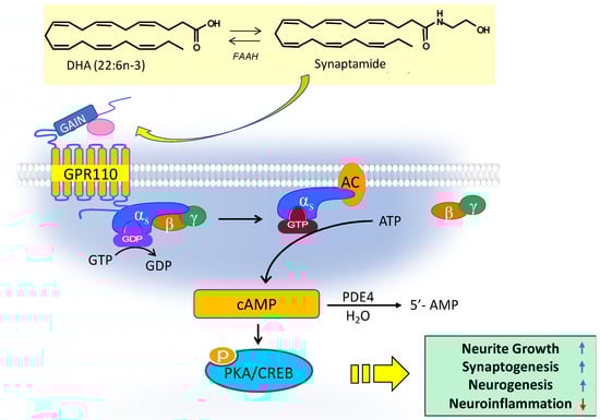 Synaptamide derived from DHA is an endogenous ligand of GPR110 (ADGRF1), an orphan receptor that belongs to the adhesion G-protein-coupled receptor (aGPCR) subfamily. The neurotrophic and neuroprotective effects of synaptamide, such as neurogenesis, neurite growth, synaptogenesis, and anti-inflammatory effects, are mediated by its binding to GPR110, activating the cAMP/PKA pathway and promoting PKC and CREB phosphorylation [,]. Synaptamide potently induces cAMP production with EC50 in the low nM range in cultured cortical neurons [,], neural stem cells [] and microglia []. The disruption of this binding by GPR110 antibodies or GPR110 gene knockout abolishes the synaptamide-induced bioactivity. The central role of GPR110 in this process is illustrated schematically in Figure 5.