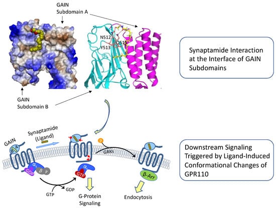 Distinctively, aGPCRs contain a GPCR-autoproteolysis-inducing (GAIN) domain located at the N-terminal region immediately before the seven-transmembrane domain (7TM). Cleavage at the GPCR proteolytic site (GPS) in the GAIN domain results in the exposure of a conserved Stachel sequence. It is postulated that the Stachel sequence interacts with the 7TM and thereby activates the aGPCRs, but Stachel-dependent signaling can also occur in a manner that is independent of the autoproteolysis of the GAIN domain [,]. Interestingly, synaptamide binds to the GAIN domain and activates GPR110 signaling without self-cleavage at the GPS, and GPR110 is not activated by the Satchel peptide. These findings indicate that the mode of GPR110 activation is clearly different from other aGPCRs.