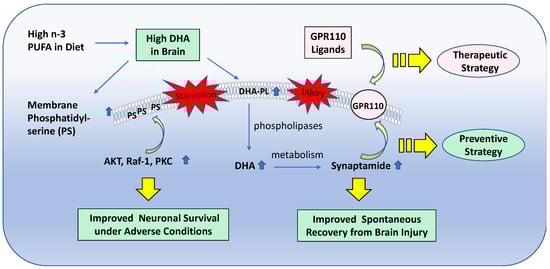 Based on the molecular and cellular mechanisms for DHA-derived bioactivity, the strategies for neuroprotection can be devised as depicted in Figure 7. The enrichment of DHA in neuronal membranes increases the PS, which can facilitate the translocation and activation of key kinases such as Akt, Raf-1, and PKC and promote neuronal survival under adverse conditions. DHA enrichment also expands the precursor pool for the endogenous production of a variety of bioactive DHA metabolites such as synaptamide, providing a preventive strategy for accidental brain injury by improving spontaneous recovery. Synaptamide, in particular, by specifically binding to the GAIN domain of GPR110, activates cAMP signaling; promotes neurogenesis, neurite growth, and synaptogenesis; and suppresses neuroinflammation. It thus suggests the therapeutic potential of synaptamide analogues in neurodevelopmental disorders and neurodegenerative conditions as well as various central nervous system injury scenarios.