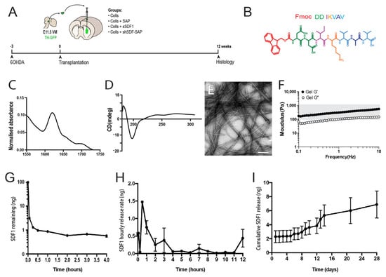 Generation and characterization of SDF1-functionalised hydrogel. (A) Schematic of in vivo experimental design highlighting the time frame of 6OHDA lesioning, neural progenitor/biomaterial implantation and histological assessment. (B) Illustration of the Fmoc-based peptide sequences, IKVAV. (C) Peptide interaction, through hydrogen bonds and secondary β sheet formation was confirmed by Fourier transform infrared (FTIR) of amide I region, showing characteristic peak for β sheets with an observable carbamate peak. (D) The stable formation of a dominant assembly, showing transition peaks at 200 nm, was confirmed by circular dichroism spectroscopy. (E) Representative electron micrograph illustrating the nanofibril structural organisation. (F) Storage (G′, black circles) and loss (G″, white circles) modulus for the IKVAV SAP hydrogel, showing similar stiffness to the rodent brain (indicated by grey shading). (G) Soluble SDF1 recombinant protein in media rapidly degraded (>90% degradation within minutes). (H,I) Shear entrapment of SDF1 in the SAP hydrogel resulted in sustained release, observed over 28 days. Scale bar: 100 nm.