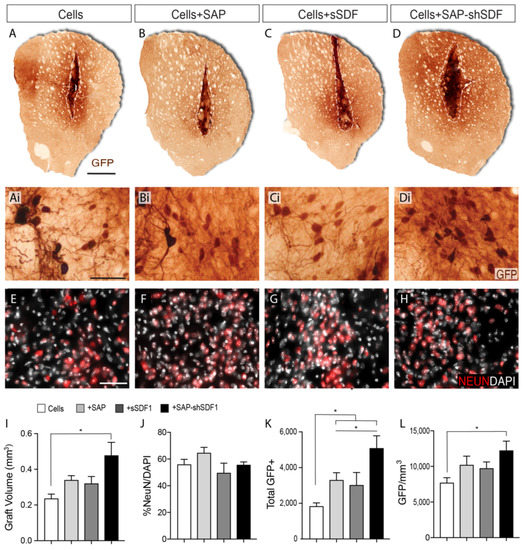 - Somaa, F.A.; Wang, T.Y.; Niclis, J.C.; Bruggeman, K.F.; Kauhausen, J.A.; Guo, H.; McDougall, S.; Williams, R.J.; Nisbet, D.R.; Thompson, L.H.; et al. Peptide-Based Scaffolds Support Human Cortical Progenitor Graft Integration to Reduce Atrophy and Promote Functional Repair in a Model of Stroke. Cell Rep. 2017, 20, 1964–1977. [Google Scholar] [CrossRef]