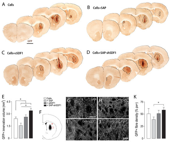 The immunological response of the host to the implantation of the cell grafts (in the presence or absence of the hydrogel and SDF1 protein) was assessed at predetermined sites lateral to the graft-host border (delineated according to GFP labelling), as depicted in Supplementary Figure S1A. The area covered by GFAP or CD11b immunoreactivity was expressed as a percentage of the total pixels in the Cells, Cells+SAP, Cells+sSDF1 and Cells+SAP-SDF1 grafted brains.
