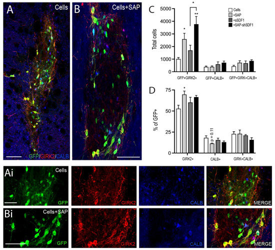Critical for the restoration of motor function following transplantation is not only the capacity for the new DA neurons to synaptically integrate, but more specifically the ability of the A9 DA neurons to form connections—a subpopulation of DA cells that normally reside in the SNpc and form the nigrostriatal pathway, innervating the dorsolateral striatum. We therefore examined the number of A9 and A10 neurons within the grafts, assessing GIRK2+GFP+, CALBINDIN+GFP+ and GIRK2+CALBINDIN+GFP+ cells, Figure 4. Grafts in the presence of the SAP hydrogel showed a 2.6-fold increase in GFP+/GIRK2+ co-localised cells (Cells: 1013 ± 121; Cells + SAP: 2589 ± 461). In contrast SDF1 had no impact on A9 fate, with acute delivery failing to significantly increase the number of GIRK2+ cells within the graft (Cells + sSDF1: 1695 ± 461) compared to Cells alone. Sustained SDF1 delivery showing further significant increase in A9 specification compared to Cells + SAP (Cells + SAP-shSDF1: 3774 ± 608), Figure 4A–C. No change in either GFP+/Calbindin+ or GFP+/GIRK2+/Calbindin+ neurons was observed, Figure 4D.