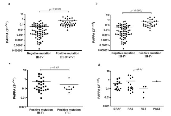2.3. PAPPA Expression Showed a High Sensitivity and Negative Predictive Value to Identify Nodules with Genetic Alterations