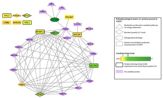 To further understand the intermolecular relationships identified by ANNs, we generated a protein interactome with the human protein network used for model construction and based on publicly available sources. This allowed us to identify the interaction between the most differentially expressed (‘candidate’) proteins and the effector proteins identified as important in GSDV molecular characterization (Table 5, Figure 1). Most of the candidates showed an interaction with effectors of the biological motives elevated cytosolic calcium levels-persistent contraction of muscle cell (Supplementary Tables S3 and S5). However, two of the most differentially expressed proteins, the skeletal muscle isoform of the myosin regulatory light chain 2 (MYLPF) and PYGM, interacted with proteins belonging to the modulation of alternative metabolic pathways for energy obtainment-increased glucose uptake motif. In addition, according to the databases used (see topological analysis in the methods section), six of the most differentially expressed proteins (i.e., MYH1, ATP2A1, isoform 1 of four and a half LIM domains protein 1 (FHL1), four and a half LIM domains protein 3 (FHL3), aldose reductase (AKR1B1) and carboxymethylenebutenolidase homolog (CMBL)) did not directly interact with any of the GSDV effectors nor with any other most differentially expressed proteins (Table 5).