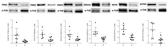 To validate the predictive results obtained using the ANN analysis strategy, skeletal muscle levels of a selected group of candidate proteins were also analyzed by Western blot in GSDV patients and healthy controls. We selected as candidates the most differentially expressed proteins that were classified in the ‘very strong’ and ‘strong’ categories according to their relationship with GSDV as a whole (Table 5): MYH1, ATP2A1, TPM1, TNNI2, and TNNT3. Besides these proteins, ACTN3 was also considered a candidate and analyzed despite being ranked in the medium-strong category, due to two relevant reasons: (i) it has been documented to interact with PYGM and implicated in altered muscle calcium handling in the Actn3 deficient (knockout) mouse model [], and (ii) at least in female patients, ACTN3 genotypes might contribute to explaining individual variability in the phenotypic manifestation of this disorder [,]. We showed that the expression levels of all tested candidates (MYH1, ATP2A1, TPM1, TNNI2, TNNT3, and ACTN3) were significantly lower in patients than in controls (Figure 2 and Supplementary Figure S1).