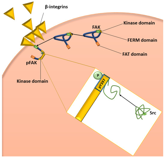 Vascular permeability is a significant contributor to the tumour microenvironment, with overexpression of VEGF ligands and receptors resulting in hyperpermeable vasculature leading to an increase in hypoxic regions within tumourigenic tissues, which further stimulates VEGF expression [11,29,30,31]. Vascular permeability is also mediated by focal adhesion tyrosine kinase (FAK), a protein-tyrosine kinase, which is activated by VEGF and integrins through increased phosphorylation of the activation loop within the FAK protein structure located in focal contacts (Figure 2) [35,36,37]. FAK is essential in the signalling network between growth factors, including VEGF and other adhesion role-players such as β-integrins, with the downstream effects of these networks influencing vascular permeability, cell proliferation, and migration [35,37]. The autophosphorylation of FAK, facilitated by the clustering of β-integrins at pY397, is a crucial autophosphorylation site of FAK activation since the kinase domain is only capable of activating FAK once autophosphorylation has occurred [31,33,38,39]. In the event of cells forming attachments to adjacent cells, integrins will cluster and facilitate the binding of the erythrocyte band 4.1, ezrin, radixin, moesin homology (FERM) domain to cytoplasmic tails of β-integrin. Then, the FERM domain will release the kinase domain leading to the unfolding of the FAK protein to expose the kinase domain, thus allowing the autophosphorylation of pY397 and the subsequent activation of FAK (Figure 2) [31,39]. It has been suggested that there is a significant difference in the expression of FAK between non-tumourigenic and tumourigenic cells, with most studies indicating increased expression of FAK messenger ribonucleic acid (mRNA) in several cancer types, including invasive breast cancer, colon cancer, and prostate cancer, implicating that FAK may be involved in the progression of tumours [33,38,39,40]. Furthermore, overexpression of FAK is seen more within highly metastatic and invasive tumourigenic cell types [41]. FAK is also associated with cell migration since it functions as a motility regulator that possibly influences downstream pathways, including rat sarcoma (RAS) expression, and thus, FAK upregulation is associated with the promotion of cell migration [41].