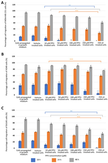 The relative percentage migration compared to MDA-MB-231 (A), A549 (B), and DU145 (C) cells at 0 h exposure when cells were exposed to PPV (10–150 µM). The average of three independent experiments is represented by the graph with error bars indicating standard deviation. The blue bar represents the percentage of the cell migration of the cells after 18 h of exposure, the orange bar represents the percentage of cell migration of cells after 24 h of exposure, and the grey bar represents the percentage of cell migration of cells after 48 h of exposure. The statistical significance of cell migration after 18 h of exposure is indicated with an asterisk (**), the statistical significance of cell migration after 24 h of exposure is indicated with two asterisks (***), and the statistical significance of cell migration after 48 h of exposure indicated with three asterisks (*). The positive control for the migration assay-included cells exposed to 2-ethyl-17-hydroxy-13-methyl-7,8,9,11,12,13,14,15,16,17-decahydro-6-cyclopenta[a]phenanthren-3-yl sulphamate (ESE-ol) (0.4 µM) for 48 h. Statistical significance is represented by an * when using the student t-test with a p value of 0.05 compared to cells propagated in complete growth medium.