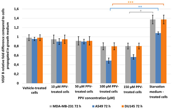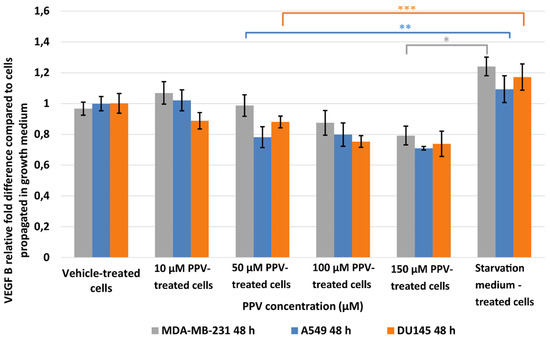 The effects of PPV on VEGF expression were investigated in MDA-MB-231-, A549-, and DU145 cells. Results indicated that a statistically significant fold decrease to 0.79 was observed in VEFG B expression in MDA-MB-231 cells exposed to 150 µM PPV for 48 h compared to cells propagated in a complete growth medium (Figure 4). Furthermore, exposure to 50, 100, and 150 µM of PPV in A549 cells for 48 h resulted in a statistically significant fold decrease to 0.78, 0.79, and 0.71 when compared to cells propagated in a complete growth medium. Exposure to PPV for 48 h demonstrated a statistically significant fold decrease to 0.88, 0.75, and 0.73 when exposed to 50, 100, and 150 µM PPV in DU145 cells compared to cells propagated in a complete growth medium. The results, therefore, indicate that exposure to increasing concentration of PPV correlates with a decrease in VEGF B expression after 48 h in all three cell lines. Furthermore, results indicate that the PPV affects VEGF B expression in a cell line-specific manner, with the A549- and DU145 cell lines most prominently affected by PPV.