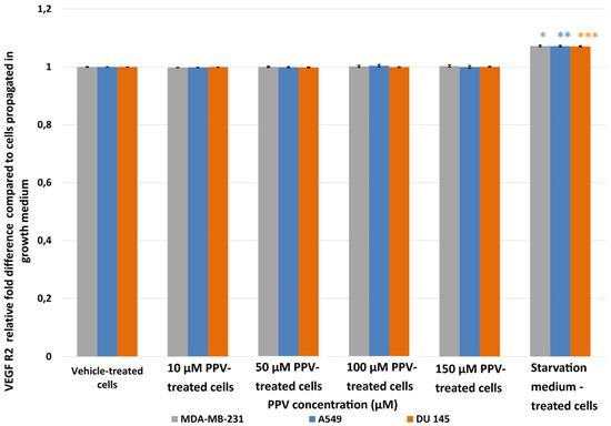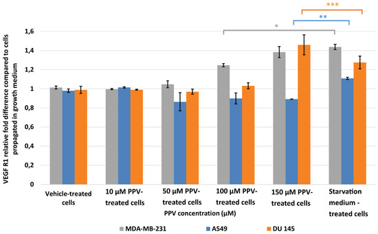Results indicated that a statistically significant fold increase to 1.25 and 1.38 in VEGF R1 expression was observed in MDA-MB-231 cells after exposure to 100 and 150 µM PPV for 48 h compared to cells propagated in a complete growth medium (Figure 6). Furthermore, exposure to 150 µM PPV for 48 h resulted in a statistically significant fold decrease to 0.90 in A549 cells compared to cells propagated in a complete growth medium. Exposure to 150 µM PPV for 48 h led to a statistically significant fold increase to 1.46 in DU145 cells compared to cells propagated in a complete growth medium. These results indicate that the change in VEGF R1 expression is cell-line specific, with MDA-MB-231- and DU145 cell lines most affected by higher concentrations of PPV.