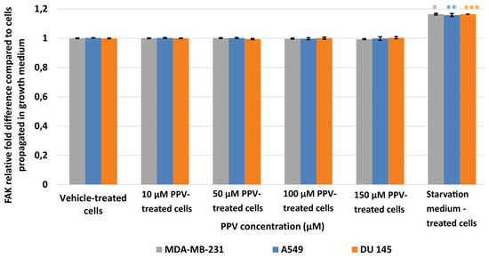Spectrophotometry results of FAK ELISA demonstrating the effects of PPV (10–300 µM) on proliferation on MDA-MB-231 cells compared to A549- and DU145 cell lines at 48 h. The average of there independent experiments is represented by the graph with error bars indicating standard deviation. The statistical significance of MDA-MB-231 cells is indicated with an asterisk (*), the statistical significance of A549 cells is indicated with two asterisks (**), and the statistical significance of DU145 cells is indicated with three asterisks (***). Statistical significance is represented by an * when using the student t-test with a p value of 0.05 compared to cells propagated in complete growth medium.