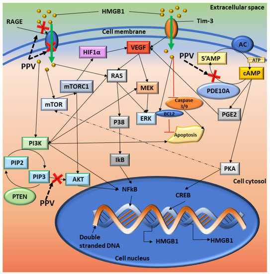 Summary of the proposed cellular signalling affected by PPV. Red crosses indicate the possible sites where PPV exerts its effects. Solid black arrows indicate the pathways and dotted arrows indicate a possible interaction. HMGB1 interacts with RAGE which induces cellular signals that affect several pathways. Once NF-kB is activated, it translocates to the nucleus where it interacts with DNA and upregulates the transcription of several genes, including HMGB1 and TNF. The interaction of HMGB1 with T Cell immunoglobulin mucin–3 (TIM-3) induces the secretion of VEGF to promote tumour angiogenesis, an immunoregulatory protein. VEGF can then stimulate MEK, which leads to ERK activation. AC controls the formation of cAMP from 5′AMP, and PDE10A degrades cAMP back into 5′AMP. Inhibition of PDE10A can lead to the build-up of cAMP, which increases the available levels of PKA and PGE2. PKA can then upregulate CREB, which increases the transcription of several downstream molecules, including HMGB1, and surviving. HMGB1 can inhibit the caspase 3/9 pathway, releasing proapoptotic inhibitors such as BAX and controls the protein levels of Bcl-2 [53,54]. Image designed by DA Gomes using Microsoft® Office PowerPoint (Microsoft Office enterprise 2007, 2006 Microsoft Corporation, Redmond, WA, USA).