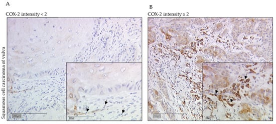 In 2020, more than 17,000 women worldwide died from vulvar cancer. The number of new cases has been steadily increasing over recent decades, with a worldwide incidence of 45,240 new cases []. An additional threat is the fact that a continuous increase in new cases in young women has been observed [,]. A total of 90% of vulvar carcinomas are squamous cell carcinomas (VSCC). Non-keratinized squamous cell carcinomas are often human papilloma virus (HPV)-associated and mainly affect younger women [,]. Essential for malignant transformation in HPV-dependent carcinogenesis is the inactivation of p53 and the retinoblastoma tumor-suppressor gene product by the viral gene products E6 and E7 []. In contrast, keratinized squamous cell carcinomas are usually HPV-independent and, due to chronic genital inflammatory disease, such as lichen sclerosus, affect older women [,]. Beside HPV, the development of vulvar carcinomas is associated with other risk factors: immunosuppression, smoking [], and sexually transmitted diseases, such as herpes simplex virus 2 infections [], are associated with an increased risk of this disease. Radical surgical interventions are predominantly used for therapy, often ending in vulvectomy in the case of extensive involvement. To date, the mental consequences of such a serious and extensive intervention have not been studied extensively. Sexual behavior restrictions, micturition problems, or even mental effects that impair quality of life are long-term consequences of this radical form of therapy [,]. As for prevention, HPV vaccination, for example, has been seen as a new hope in fighting against HPV-related tumors such as cervical, anal, and vulvar cancers [,]. In 2016, the EURO Vaccination Meeting listed Belgium as the top country with a vaccination rate of 84%, while in Germany the vaccination rate reached a critical 31% in 2015 []. Based on the low vaccination rate and an aging population in Germany it can be assumed that the need for newly found prognostic factors for vulvar carcinoma is even more apparent. Our group showed negative prognosticators in vulvar cancer patients, such as LDOC1 [] or combined expression of COX-2 and PPARγ in cytoplasm of vulvar cancer tissue []. An increasing number of new cases, younger patients, radical therapy, and a lack of comprehensive prevention due to the low vaccination rates, at least in this country, are concerning observations. Cyclooxygenase-2 (COX-2) features as a long-standing object of scientific interest in the context of carcinogenesis in several tumor entities [,,,,]. COX-2, in contrast to the constitutive housekeeping enzyme COX-1, is inductively expressed as a known inflammatory enzyme [,]. Tissues of the brain, kidney, testis, and tracheal epithelium are exceptions with respect to constitutive COX-2 expression [,]. The inducing of the COX-2 enzyme is triggered by cell damage or inflammation by the release of various factors, such as growth factors like epidermal growth factor (EGF) [], prostaglandins, or chemokines like TNF-γ []. Affecting COX-2 products, the prostanoids appear to be associated with the development and progression of tumor disease. Factors such as angiogenesis, invasion, apoptosis inhibition, growth, and aggressiveness of the tumor seem to be highly dependent on COX-2 and its products [,]. It is thought that products of COX-2, such as prostaglandin E2 (PGE2), critically influence the development of tumors e.g., in angiogenesis [,]. COX-2 is also known to be active in cancer-associated immune cells [,]. We used the abbreviation sTILs (stromal tumor-infiltrating lymphocytes) in our study for these cells. They have become important players in immuno-oncology with regard to predicting prognosis in cancer patients [,,,]. Already in the treatment of breast carcinomas, the presence of sTILs is taken into account in the interpretation of tumor biology and ultimately in the decision-making process of the optimal therapy according to guidelines []. Due to the diverse cell populations within sTILs, the subgroups are not fully understood in their prognostic role and are potentially conceivable as biomarkers in the future [].