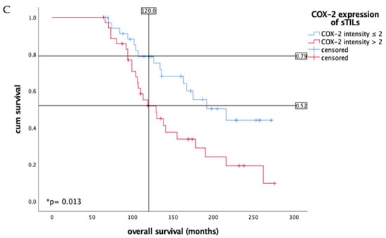 Immunohistochemistry staining of COX-2 (10× and 25× magnification) in vulvar cancer tissue showing expression of stromal sTILs with intensity of COX-2 expression < 2 (A) and ≥2 (B). The arrows in both figures mark exemplarily sTILs (A,B). The Kaplan–Meier curve shows a significantly worse overall survival rate for the patients with a strong COX-2 intensity of sTILs > 2 in long- term survival of 10 years (* p = 0.013, (C)). (C) is labeled with the percentage of patients with vulvar carcinoma still alive after 10 years: In the group of patients with COX-2 expression of sTILs ≤ 2 of vulvar carcinoma, 79% are still alive, whereas among the diseased women with higher COX-2 expression of sTILs, only 52% are still alive in comparison.
