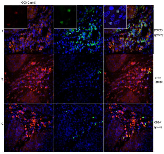 The immune cell subpopulations were quantified by counting CD56-, CD68-, and FOXP3-positive cells per field of view (20× magnification). Subtyping COX-2 expressing sTILs by immunofluorescence staining revealed parallel expression of FOXP3 in a clear majority (Figure 2 and Figure 3).