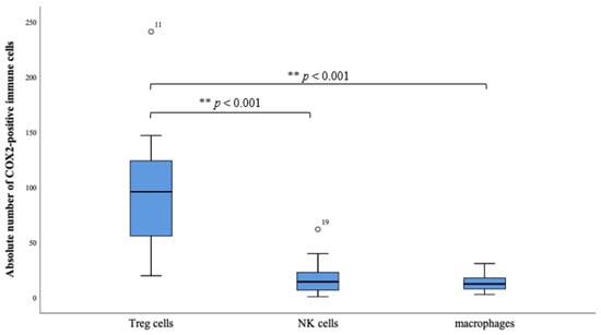 The boxplots reveal the absolute number of COX-2 positive Treg cells (FOXP3+), NK cells (CD56+) and macrophages (CD68+). There is a clear distribution in the direction of the Treg cells. The box plots indicate mild outliers, which are marked with circles. These outliers (case numbers 11 and 19) show an interquartile distance to the third quartile of values that is less than three times higher than the third quartile of values. The difference of the occurrence of the subtypes Treg cells to NK cells, as well as Treg cells to macrophages, is highly significant (** p < 0.001).