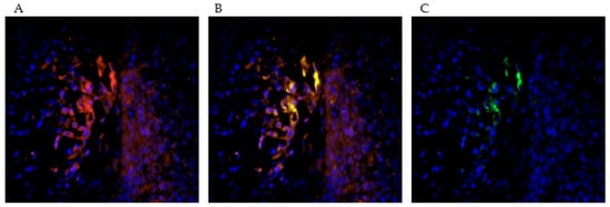 The same formalin-fixied and paraffin-embedded samples were placed in xylol for 20 min for deparaffinization. Subsequently, the sections were panned in ethanol in order of descending concentrations (100%, 70%, 50%) and washed in distilled aqua. Unmasking of antigens was performed simultaneously with the immunohistochemistry protocol by a 5 min heat pretreatment in a pressure cooker in the citrate buffer-use solution described previously. After washing in distilled water and PBS for 4 min, incubation with UltraV block solution (Labvision, Fremont, CA, USA) was performed. The solution was tipped off after 15 min and the primary antibodies were applied. COX-2 was stained at a ratio of 1:400 together with CD56 (Bio-Rad, Oxford, United Kingdom, MCA591) at a ratio of 1:100, CD68 (Sigma, St. Louis, MO, USA, AMAb90874) at a ratio of 1:8000, or FOXP3 (Abcam, Cambridge, United Kingdom, ab20034) at a ratio of 1:300 in dilution medium (Dako, Glostrup, Denmark, S3022) to differentiate cells in a double staining procedure. CD56 is a known structural protein of natural killer (NK) cells [], CD68 is known as a structural protein of macrophages, and FOXP3 is expressed specifically by regulatory T (Treg) cells [,,]. Double staining with PPARγ and CD68 was performed to subtype macrophages []. Here, a concentration of 1:100 was chosen for the PPARγ antibody (Abcam, Cambridge, United Kingdom, ab27649) and CD68 was added, as in the double staining with COX-2.
