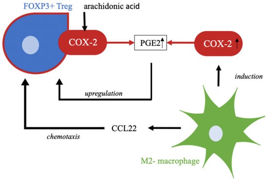 COX-2 produces PGE2, a prostaglandin, from the substrate arachidonic acid as part of lipid metabolism. Upregulation of Treg cells is affected by this prostaglandin. M2-polarized macrophages attract regulatory T cells by chemotaxis, e.g., by CCL22. In addition, M2-polarzied macrophages induce expression of COX-2, which in turn leads to higher enzyme activity and thus higher accumulation of products, such as PGE2 [,,,,].