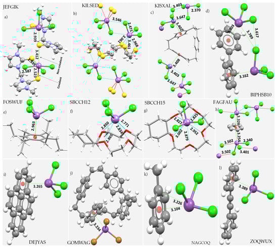 Some selected examples (with CSD codes in capital letters) illustrating the possibility of Sb···X pnictogen bonding interactions formed by covalently bound Sb in SbCl3 and SbBr3 upon attractive engagement with a variety of interacting molecules containing pnictogen bond acceptors X, where X refers the halogen derivatives, O, S, and π-density. Selected Sb···X intermolecular distances and the Sb–X covalent/coordinate bond distances (in Å) are shown for most cases, indicating clear evidence of the difference in distances between Sb···X and Sb–X. The centroid of the arene moiety (tiny sphere in red) to Sb distances in several cases are also shown in Å. Atom type is shown where appropriate. The compounds are (a) SbCl3mbit (mbit = bidentate 1,1’-methylene-bis(3-methyl-2H-imidazole-2-thione) []; (b) SbCl3.18S6 (18S6 = the crown ether 1,4,7,10,13,16-hexathiacyclooctadecane) []; (c) (C24H24)(SbCl3)2 (C24H24 = [2.2.2]paracyclophane) []; (d) biphenyl bis(antimony trichloride) []; (e) (C18H30)SbCl3 (C18H30 = hexaethylbenzene) []; (f) (cyclohexo-12-crown-4)SbCl3 []; (g) (cyclohexo-15-crown-5)SbCl3 []; (h) (benzene)(SbCl3)2 []; (i) pyrene bis(trichloro-antimony) []; (j) [2.2.2.2]-Paracyclophane tribromo-antimony []; (k) trichloro-antimony toluene []; (l) tetrakis(trichloro-antimony) 1,2-diphenylethyne [].