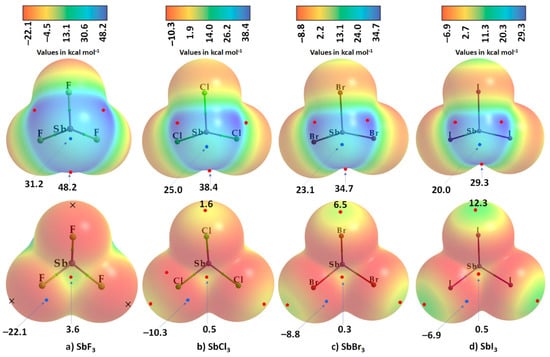In the various examples provided in Figure 1, we mainly focus on highlighting the intermolecular bonding modes of SbX3 and a few other compounds containing Sb. As can be seen, the SbX3 molecules have a trigonal pyramidal molecular geometry. In order to understand the chemical reactivity of the various constituents of SbX3 that are responsible for the intermolecular interactions in the crystals, we focused on examining the nature of the electrophilic and nucleophilic regions on the electrostatic surfaces of isolated SbX3 molecules. We did so by exploring the MESP at the MP2(full)/def2-TZVPPD and ωB97XD/def2-TZVPPD levels of theory. Our results for the local maxima and minima of potential on the electrostatic surface of the SbX3 molecules are shown in Table 2. Figure 2a–d shows the MESP graphs for the isolated SbX3 molecules.