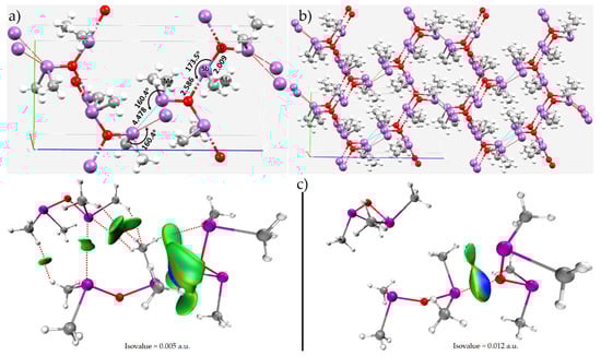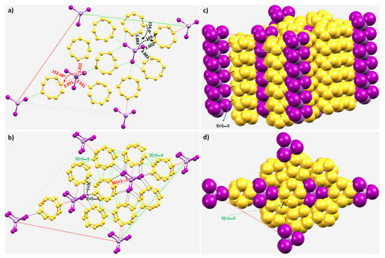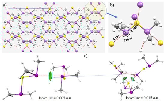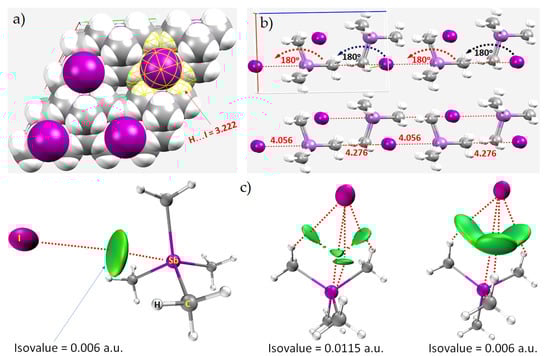 Our observation is in line with that of the authors of [], in that the coordination around antimony is distorted tetragonal pyramidal, and the tetrahedral coordination of the ions in the structure results in the formation of a wurtzite-type structure with antimony-iodine distances of 4.06 and 4.35 Å. Although the non-covalent bonding features that occur in the crystal constitute σ-hole interactions, the involvement of the σ-holes on H and Sb in the long-range interactions cause the formation of a layer-type molecular framework in the crystal (Figure 3b).