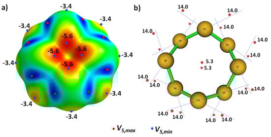 (a) ωB97XD/aug-cc-pVTZ computed 0.0015 a.u. isoelectron density mapped potential on the electrostatic surface of the S8 molecule. (b) Illustration of the molecular framework, with only the local most maximum of potential (VS,max) along the outer extensions of the S–S covalent bonds. Values of the local most minima of potential (VS,min) on the electrostatic surface of the S8 molecule is shown in (a). Values of VS,max and VS,min are in kcal mol−1.