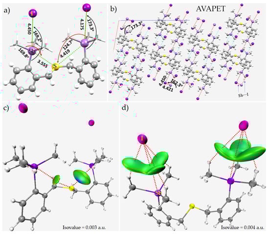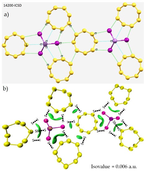 The authors of the original study [] suggested the presence of intermolecular bonding between I and S sites, basing this conclusion on the intermolecular distance between I and S atoms, and within the conceptual framework of Lewis structures of chemical bonding. In particular, they observed that each iodine atom has two pairs of sulfur neighbors with I···S separation distances lying between 3.78 and 3.88 Å. The stability of the structure was attributed not only to these I···S charge transfer interactions, but also to some extent to Sb···I interactions. However, it was not clear whether these interactions are halogen bonds or chalcogen bonds in the first case, or halogen bonds or pnictogen bonds in the second case, since these bonding terminologies were not coined in 1963.