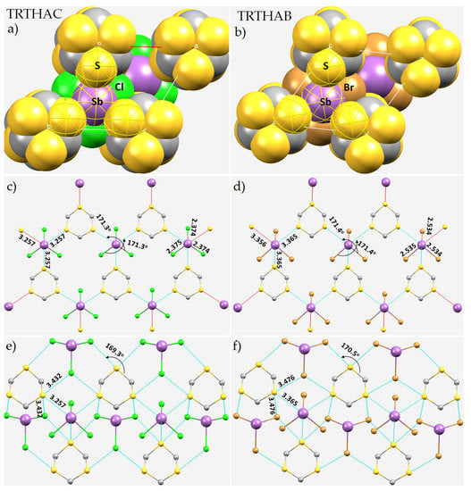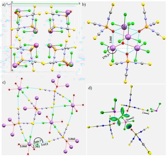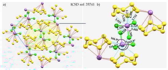 Another adduct between an antimony halide and molecular sulfur is SbCl3.S8; see Figure 7. It crystallizes in the triclinic P-1 space group []. The unit-cell contains two SbCl3 and two S8 molecules, and the crystal is zero-dimensional []. Sb in each SbCl3 molecule links with several S sites of the crown-shaped S8 ring, as well as with the negative sites on Cl in close proximity (see dotted lines in Figure 7a). Compared to the formal Sb–Cl bond distances (r(Sb–Cl) = 2.60–2.34 Å; see Figure 7b) between Sb and Cl which are responsible for the trigonal pyramidal geometry of SbCl3, the Sb···S and Sb···Cl intermolecular interactions are much longer (r(Sb···S) in the range 3.448–4.320 Å; r(Sb···Cl) = 3.228 Å; Figure 7b). Several of them are non-linear and those appearing along the three Cl–Sb extensions are quasi-linear. All these interactions are Sb-centered pnictogen bonds. Additionally, there are Cl···S halogen bonds, and S···Cl and S···S chalcogen bonds in the crystal (not shown). The formation of these intermolecular interactions is in agreement with the electrostatic surface features of the interacting molecules revealed by the MESP model discussed above (see Figure 2b and Figure 4 for SbCl3 and S8, respectively); together they are responsible for the stability of the SbCl3.S8 system in the crystalline phase. Theoretically, the SbCl3.S8 crystal system is thermally stable with a bandgap of 2.88 eV [], and is thus a semiconducting material.