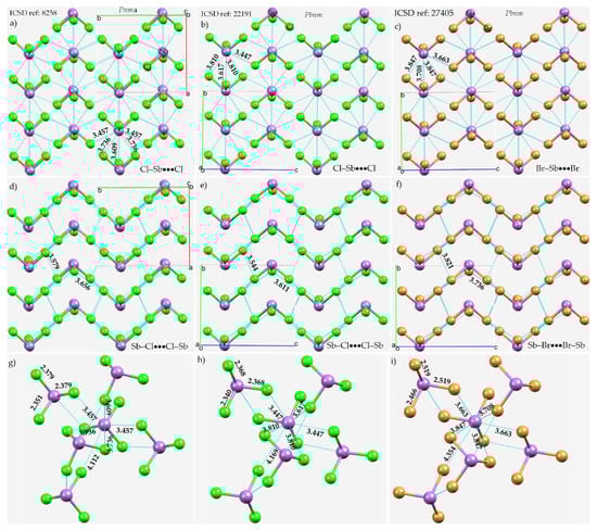 (a,b) The 2 × 2 extended structures of the SbCl3 crystal in the space groups Pnma and Pbnm, respectively; (c) The 2 × 2 extended structure of SbBr3 (space group Pbnm). In all three cases, Cl–Sb···X (X = Cl, Br) intermolecular pnictogen bonding interactions are illustrated as dotted lines in cyan. (d–f) Representation of the structures of the same crystal systems, illustrating the presence of X···X (X = Cl, Br) intermolecular contacts. (g–i) Illustration of the local pnictogen bonding environment around the Sb3+ ion in SbX3. Selected bond distances are in Å and degrees, respectively.