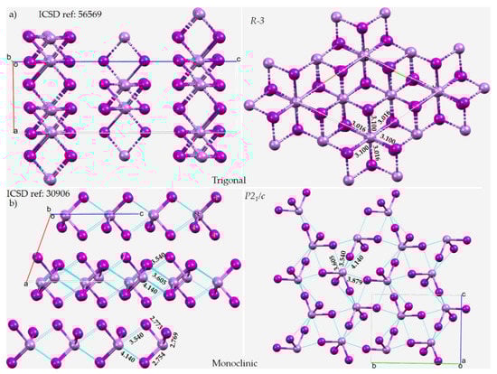 By contrast, the SbI3 system crystallizes in two space groups, i.e., monoclinic (P21/c) and trigonal (R-), and is non-magnetic []. The crystal structure of the latter, depicted in Figure 10, shows that it adopts a layered geometry, and that the neighboring layers are linked to each other through a number of Type-IIa halogen-centered I···I interactions (r(I···I) = 3.958; ∠Sb–I···I = 164.5°) that are less than twice the vdW radius of I, 4.08 Å. However, in the monoclinic crystal, the isolated SbI3 molecules are linked with each other by means of a 3D network of I–Sb···I intermolecular contacts. Both the monoclinic and trigonal structures of SbI3 possess wide band gap transition energies [] (2.217 eV for the monoclinic geometry and 2.211 eV for the trigonal geometry), indicative that they are semiconducting materials. Kang et al. have theoretically determined that SbI3 has a strong second harmonic generation effect []. Onodera and coworkers have experimentally demonstrated that SbI3 is a promising material for use in radiation detectors; it is stable under operating conditions, similar to popular semiconductor detectors CdTe and TlBr [].