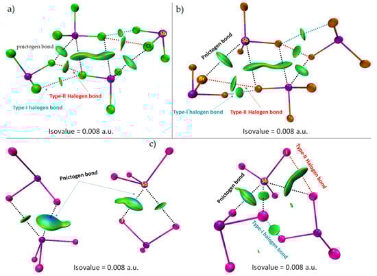 The IGM-δg results given in Figure 11 confirm the intermolecular pnictogen bonding interactions that were identified between the interacting molecules in SbX3 (X = Cl, Br, I) crystals. As discussed above, we observed that there were circular or dumbbell-shaped green isosurfaces between the Sb and X atomic basins in SbX3 (X = Cl, Br). In addition, we also identified a number of potential Type-I and Type-II Sb–X···X halogen bound interactions between the SbX3 molecules in the crystal, as marked in Figure 11a,b for SbCl3 and SbBr3, respectively. In both cases, the pnictogen bonding was stronger than the Type-I and Type-II halogen bonds, as inferred from the size and thickness of the IGM-δg based isosurfaces. The presence of Type-I and -II halogen bonding interactions between the interacting molecules was not obvious in the unit cell of the SbI3 crystal. Their presence was rationalized when the unit-cell was expanded. The IGM-δg based isosurface analysis performed on a small portion of the expanded structure of the SbI3 crystal is shown in Figure 11c (right), including both Type-I and Type-II I···I halogen bonds in the SbI3 crystal.