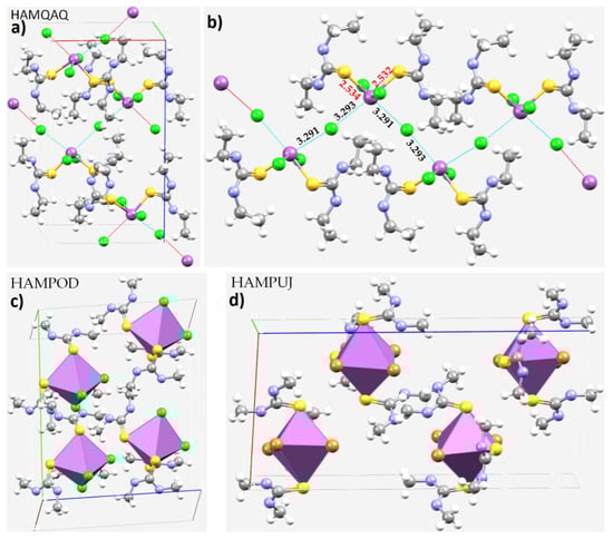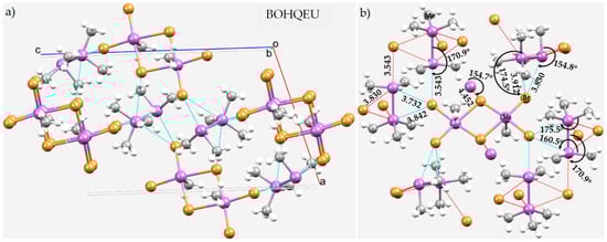 Tetramethyl-antimony iodide salt [(CH3)4Sb]+[I]− is a good example of a solid state structure featuring charge-assisted pnictogen bonding in a sterically crowded environment; see Figure 3a []. We did not perform a MESP calculation for the system, since the polarity of the molecular domains responsible for the crystal lattice is quite apparent. The methyl hydrogen atoms of the three nearest (CH3)4Sb+ moieties of the crystal are non-covalently bound with iodide anions through charge-assisted C–H···I hydrogen bonds. Six such prominent interactions are formed with I−. They are all equivalent and the angle of attack for the formation for each of these and the corresponding intermolecular distances are ∠C–H···I = 147.4° and 3.222 Å, respectively. Apart from this, [(CH3)4Sb]I features charge-assisted Type-IIa C–Sb···I pnictogen bonds (r(Sb···I) = 4.056 and 4.352 Å) and Sb–C···I tetrel bonds (r(C···I) = 4.276 Å) that are significantly longer than the hydrogen bonds, and are directional interactions (∠C–Sb···I = 180° and ∠Sb–C···I = 180°). The long intermolecular distances are not unexpected, since the sum of the vdW radii for C and Sb (r(C)vdW = 1.77 Å and r(Sb)vdW = 2.47 Å) is larger than that of I and H (r(I)vdW = 2.04 Å and r(H)vdW = 1.20 Å).