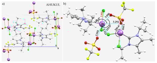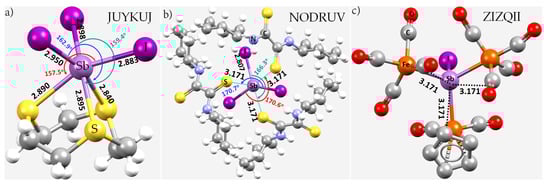 As indicated already above, the crystal systems presented in the following sections were retrieved either from the CSD [] or the ICSD [,]. We show, in some cases, that the bound antimony atom in these molecular entities has a positive site, and therefore, is capable of interacting with a negative site of a partner molecular entity. This phenomenon is either wholly or partially responsible for the overall geometric architecture and stability of the resulting crystal lattice.
