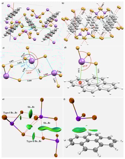 Other than these interactions, we found a pattern of a parallel arrangement between the SbF3 units along the crystallographic b-axis, in which the axes of neighboring SbF3 units are aligned (Figure 8c, top). In this arrangement, Sb in an SbF3 unit faces the center of the triangular face formed by three F atoms in another a neighboring SbF3 unit (see the first and third columns of the cluster shown in Figure 8b). These are relatively weak and non-linear Type-Ib pnictogen bound interactions, with r(Sb···F) between 3.60 and 3.80 Å and ∠F–Sb···F in the range 131.8–136.7°. They are also observable in the IGM-δg based isosurface plot shown in Figure 8d,e.