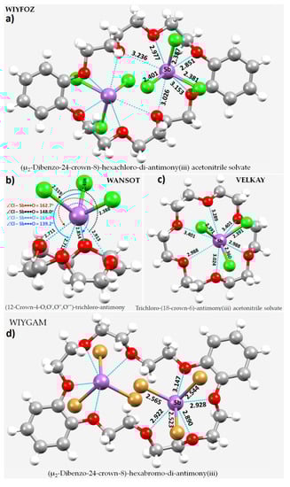 - Willey, G.R.; Aris, D.R.; Errington, W. Crown ether complexation of p-block metal halides: Synthesis and structural characterisation of [InI2(dibenzo-24-crown-8)(H2O)][InI4], [(SnBr4)2(dibenzo-24-crown-8)]·MeCN, [(SbCl3)2(dibenzo-24-crown-8)]·MeCN, [(BiCl3)2(dibenzo-24-crown-8)]·MeCN and [(SbBr3)2(dibenzo-24-crown-8)]. Inorg. Chim. Acta 2000, 300–302, 1004–1013. [Google Scholar] [CrossRef]