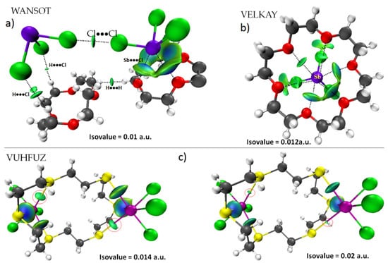 The promolecular charge density based isosurfaces were calculated within the promolecular framework of Independent Gradient Model (IGM) [,]. We did so because we were interested in the identification and subsequent characterization of Sb-centered pnictogen bonding within or between interacting monomer entities responsible for the crystals investigated, and to cross-check the reliability of these interactions emanated using intermolecular bond distances, directionality, and MESP model descriptions. Within the framework of IGM, promolecular atomic electron densities are summed, and the associated atomic gradients do not interfere. This can be achieved by using absolute values to sum the atomic gradients and by rejecting any electron gradient contragradience feature. The resulting total gradient |∇ρIGM| is an upper limit of the true gradient, and the difference between them, δg, quantifies the net electron density gradient collapse due to interactions. Ultimately, this means that the δg descriptor identifies the presence of opposite signs in the components of the total electron density gradient |∇ρ(r)| due to interactions. IGM thus has the capacity to automatically separate intra- and inter-fragment interactions in a molecular entity, and that this can be plotted in 2D or in 3D (isosurfaces) to reveal the presence of inter- or intramolecular interactions between interacting atomic basins. The 3D shape of the isosurface volumes can be utilized to infer localized or delocalized interactions between interacting domains. The colors of these isosurface volumes, in blue and green, represent strong and weak attractions, respectively, while red represents a repulsive interaction. Hereafter, we refer to this approach as IGM-δg.