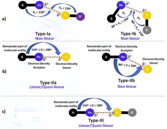 Directional interactions are linear or quasi-linear, and thus, generally follow a Type-IIa topology of bonding. Hence, when the angle of approach θ = ∠R–Pn···D = 180°, we call the interaction linear, and when it deviates from linearity such that 150° < θ < 180° (Scheme 1b, left), we refer to the interaction as quasi-linear. In either case, the electrostatic surface of covalently/coordinately bound atom Pn conceives an electrophilic region along the extension of the R–Pn covalent or coordinate bond, and D is a Lewis base (such as N in NH3, O in OH2, and F in HF). However, when 90° < θ < 150°, and Pn conceives a positive site, we recognize the interaction it forms as Type-IIb (Scheme 1b, right). Both Type-IIa and Type-IIb interactions are of coulombic origin.