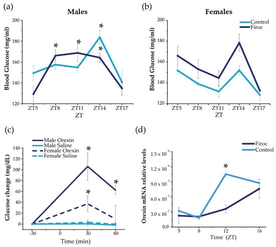 Significantly, male Firoc mice showed altered glucose rhythmicity. Similar results were reported in male orexin knockout (KO) mice []. Daily blood glucose fluctuations are regulated by the SCN through its glutamatergic and GABAergic projections to the PVN [,] and the LH [], especially to orexin neurons, and their respective para- and sympathetic innervations of the liver. This central regulation promotes a peak in blood glucose, synchronized with the beginning of the active phase [,]. We also show that central administration of orexin promotes glucose release, with a more pronounced effect in males. Other authors also reported that activation of orexin neurons in male mice promotes glucose release []. Thus, sex-dependent glucose responses to orexin introduce a possible role for estrogen on orexin function, as previously discussed by others [,].