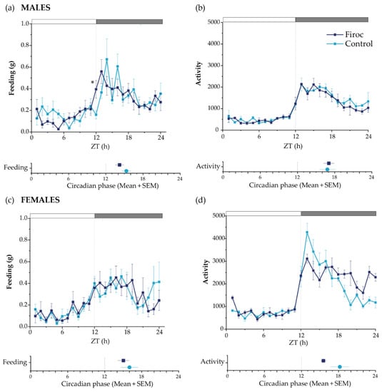 Circadian behaviors are disturbed in Firoc mice. Male (a,b) and female (c,d) Firoc (dark blue) and control (blue light) mice were phenotyped using indirect calorimetry (PhenoMaster) cages for 14 days. Food intake (a,c) and activity (b,d) were collected daily every 1 h. Data shown are the mean ± SEM for each parameter for the last 5 days at each time point. The circadian phase obtained for each parameter using the MetaCycle algorithm is shown at the bottom of each panel. Male Firoc mice showed an altered feeding behavior compared to the control mice, with an advance in feeding time (the Mann–Whitney U test, * p < 0.05), but no changes in their activity. Female female mice did not show significant changes in the feeding behavior or activity.