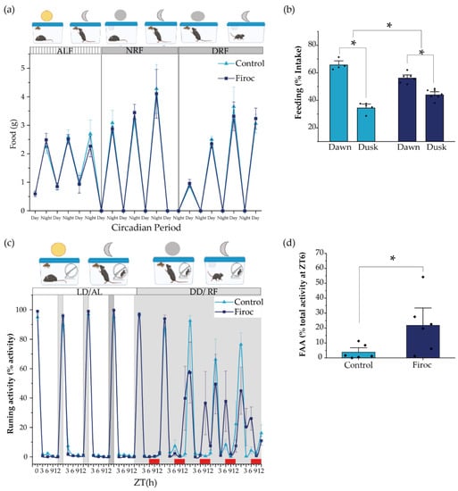 The alignment of circadian activity with the food clock is impaired in Firoc mice. (a) Both Firoc and control mice adapted to changes in light–food presentation. Mice were housed individually for 1 week under a regular light–dark cycle and ad libitum food regime (ALF). Then, the light was removed and food was restricted to the subjective night (NRF) for 4 days. After that, food availability was moved to the subjective day (DRF). Both groups spent about 4 days becoming habituated to these new conditions and started eating a similar amount of food as that consumed during the ALF experimental period. (b) However, analysis of the amount of food taken during the first 6 h in the morning (dawn) and the next 6 h in the afternoon (dusk) showed that control and Firoc mice mainly had meals during dawn (two-way ANOVA and the Tukey test, * p < 0.05), as expected, while Firoc mice showed a delayed meal (two-way ANOVA, * p < 0.05). (c) Food anticipatory activity (FAA) was measured under constant darkness after 5 days of adaptation when both control and Firoc mice ingested the same food amount. (d) Firoc mice showed an increased FAA 3 h before food presentation as compared to the control mice. N = 6–7 (two-way ANOVA, * p < 0.05).