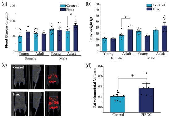 Sex-dependent metabolic disturbances in Firoc mice. (a) Blood glucose levels after 6 h fasting were significantly increased in adult Firoc males (two-way ANOVA, * p < 0.05), but not in females. (b) Bodyweight was significantly heavier only in female Firoc mice (two-way ANOVA, * p < 0.05), in an age-dependent manner. (c) A representative computerized tomography (CT) scan in control and Firoc females is shown. Fat depots are shown in red in the right pictures. (d) Fat accumulation was calculated from CT scans and shown to be significantly increased in adult Firoc females (one-way ANOVA; * p < 0.05).