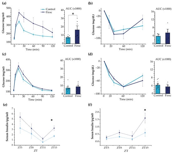 Sexual dimorphism of glucose homeostasis in Firoc mice. (a) Glucose tolerance test in male mice. Blood glucose levels and quantification histograms (area under the curve (AUC) are shown. (b) Insulin tolerance test in males. Blood glucose levels and quantification histograms (area under the curve (AUC) are shown. (c) Glucose tolerance test in females. Blood glucose levels and quantification histograms are shown. (d) Insulin tolerance test in females. Blood glucose levels and quantification histograms are shown. Firoc males (a), but not females (c), showed glucose intolerance (one-way ANOVA, * p < 0.05) compared to their respective controls. Glucose levels after systemic insulin administration remained within normal values in both male (b) and female (d) Firoc mice. Serum insulin levels were determined by ELISA at ZT5, ZT8, ZT11, and ZT15 in male (e) and female (f) Firoc and control mice. Both male and female Firoc mice showed significantly higher insulin levels at ZT15 (one-way ANOVA; * p < 0.05).