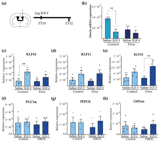 Since Firoc mice show reduced orexin levels [], we determined whether IGF-I regulates them. After ICV injection of IGF-I (1 µg) at ZT8, we analyzed the expression of orexin in the hypothalamus at ZT12 (Figure 6a). We observed that IGF-I blunted orexin mRNA levels in the control mice (two-way ANOVA and the Tukey post-hoc test, t(control saline, control IGF-I) = 5.5609, p = 0.000168), but not in Firoc mice (two-way ANOVA and the Tukey post-hoc test, t(Firoc saline, Firoc IGF-I) = 1.32427, p = 1). Confirming a direct effect of IGF-I onto orexin neurons, IGF-I (1 nM) decreased orexin mRNA levels in primary hypothalamic neuronal cultures (Figure S2).
