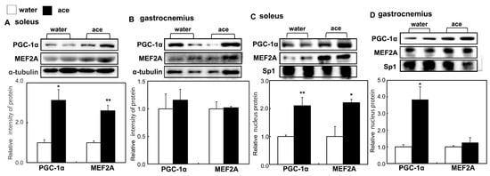 2.4. Long-Term Supplementation with Acetic Acid Stimulates the Nuclear Localization of MEF2A and PGC-1α in the Soleus Muscle of Rats during Aging
