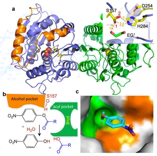 The inherent reaction catalysed by esterases is important for various industrial applications but knowing which reactions are feasible and the potential product range can be a major restriction. The basic physicochemical properties of EstN7 suggest that it could play a role in an industrial process, including optimal activity at 5–20 °C, thermal stability, organic solvent stability and metal ion sensitivity [,]. EstN7 is dimeric with an α/β fold similar to that found in other family IV esterases (Figure 1a) [,,]. The catalytic triad is comprised of S157, H284 and D254 (Figure 1a), and is located at the bottom of a cleft formed by the lid (orange section in Figure 1a). An ethylene glycol moiety was found bound within the active site that may act as a substrate/product mimic given that one alcohol group is within the H-bond distance of the S157 hydroxyl group (Figure 1a).