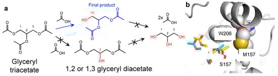 Using the available structure of EstN7, we were able to mine databases to identify potentially useful substrates for the esterase. Ideally, a commercially attractive esterase will be able to catalyse turnover of a range of substrates thus introducing the idea of functional plasticity or being catalytically precise so generating a desired single product [,]; the latter is demonstrated here with the synthetic substrate triacetin being hydrolysed at only a single terminal acetyl unit (Figure 2a and Figure S1). Virtual screening based on the EstN7 adapted version of Transform-MinER [] identified a number of reactions with high similarity to known reactions with potential commercial value based on recent purchase prices. One reaction identified with potential commercial value was hydrolysis of triacetin (glyceryl triacetate) at the terminal acetyl position to form 1,2-glyceryl diacetate (1-(acetyloxy)-3-hydroxypropan-2-yl acetate). Triacetin is the simplest of all the triacylglycerides (Figure 2a) and is itself an important commercial compound with its uses in the pharmaceutical industry as a biodegradable gel system for drug delivery []. Glyceryl diacetate, normally in the form of an isomeric mixture of the 1,2 and 1,3 forms (Figure 2a), has numerous uses in the industrial and consumer sectors, including the food industry. In our analysis of recent purchase prices, the terminal mono-deacetylated product is highlighted as more valuable: for instance, a supply of 10 g of the terminal mono-deacetylated product is ~US$ 3000 compared to 10 g of triacetin for USD 27.