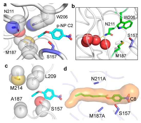 There has been a lot of focus on identifying natural esterases with the required activity [,] or engineering existing esterases to widen their substrate range [,]. Various studies have shown that altering the residues of the acyl binding tunnel can alter chain length specificity [,]. Based on analysis of the EstN7 structure, three residues that comprise the acyl binding pocket plug were targeted for mutagenesis: M187, N211 and W206 (Figure 3a,b). As mentioned above, a water-filled cavity beyond the plug is also observed in related esterase structures but the plug is absent in PestE, which is likely to be the main reason this esterase can hydrolyse longer substrates (Figure 3b) [].