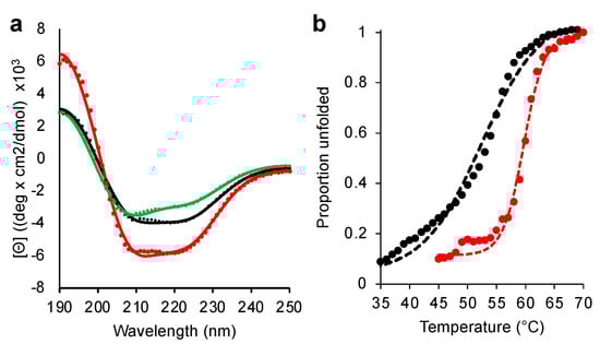 CD spectroscopy of EstN7. (a) CD spectra of EstN7WT (black), EstN7N211A (red) and EstN7DM (green). CD spectra were collected at 20 °C and a Savitzky–Golay filter applied. (b) Temperature-dependent change in proportion of protein folded (based on molar ellipticity at 222 nm at each temperature) for EstN7WT (black) and EstN7N211A (red). The dashed line represents the Boltzmann sigmoidal fit of the data (circles).