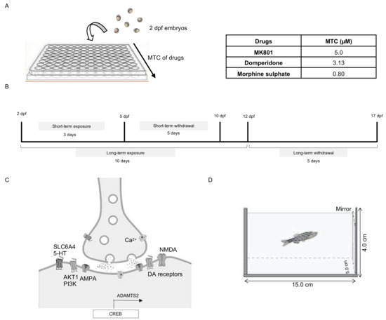 The MTC of each drug (Figure 1A; Table A1) was identified in order to optimize the short-term (3 day) and long-term (10 day) treatment protocols (Figure 1B). Dizocilpine, also known as MK801 (Sigma Aldrich, St. Louis, MO, USA), an NMDA receptor antagonist that can mimic some aspects of schizophrenia, such as hyperlocomotor behaviour, depressive symptoms and cognitive deficits [117,118], served as a positive control. MK801 was dissolved in distilled water to achieve the final concentration of 5.0 µM. According to previous studies, this dosage was able to induce social interaction deficit, a behavioural feature observed in schizophrenia, in zebrafish [91,92]. Meanwhile, embryo medium served as vehicle control. Zebrafish embryos were randomly divided into control and three treatment groups. Three groups (n = 50/group) of embryos starting at 2 dpf were examined for the effect of short-term and long-term treatments. The withdrawal syndrome of the morphine-treated larvae was assessed 5 days after the termination of treatment.